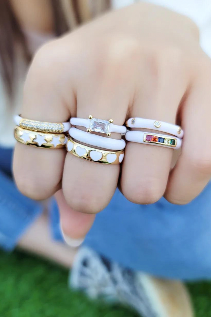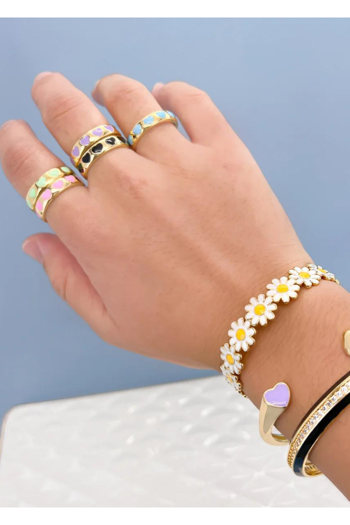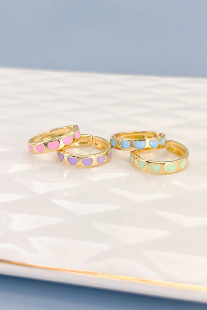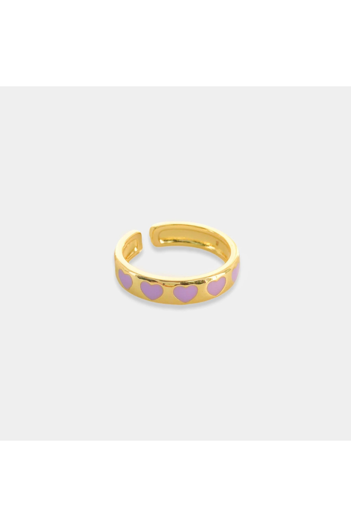 Gold ring with five enamel hearts - choose from hot pink, lavender, or white.