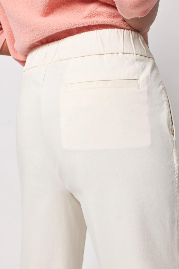 From Faherty the Every Day Cotton Pant has an elastic waistband, slash pocket at hip, single welt pocket at wearer's back right.