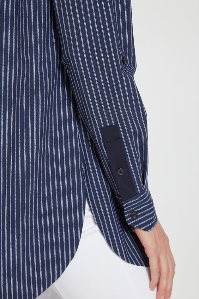 The Fashion Schiffer w Contrast Printed – made from soft, 4-way stretch Microfiber – offers a single pocket front, legging-friendly length and contrast-color detailing in True Navy. It resists wrinkles and offers a rounded, legging-friendly hem. Showcase our favorite women’s shirt, in menswear-inspired Oxford Pinstripe, with a True Navy Classic Top and Lyssé’s matching Denim Trouser Pattern, in Indigo Double Pinstripe.