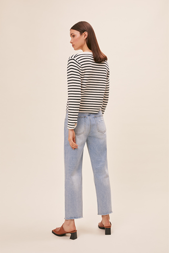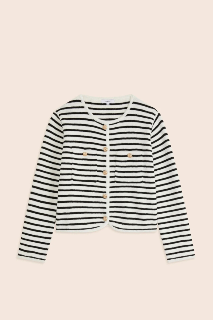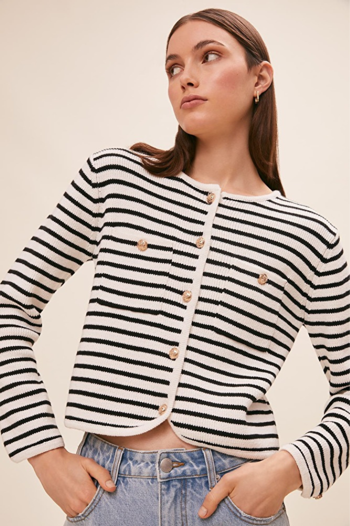 The Gabriel Cardigan is a luxurious Parisian staple that combines classic stripes with intricate button detailing. This structured cardigan adds a touch of elegance to any outfit, making it a must-have in your wardrobe. Embrace timeless style and French sophistication with the quintessential Gabriel Cardigan.