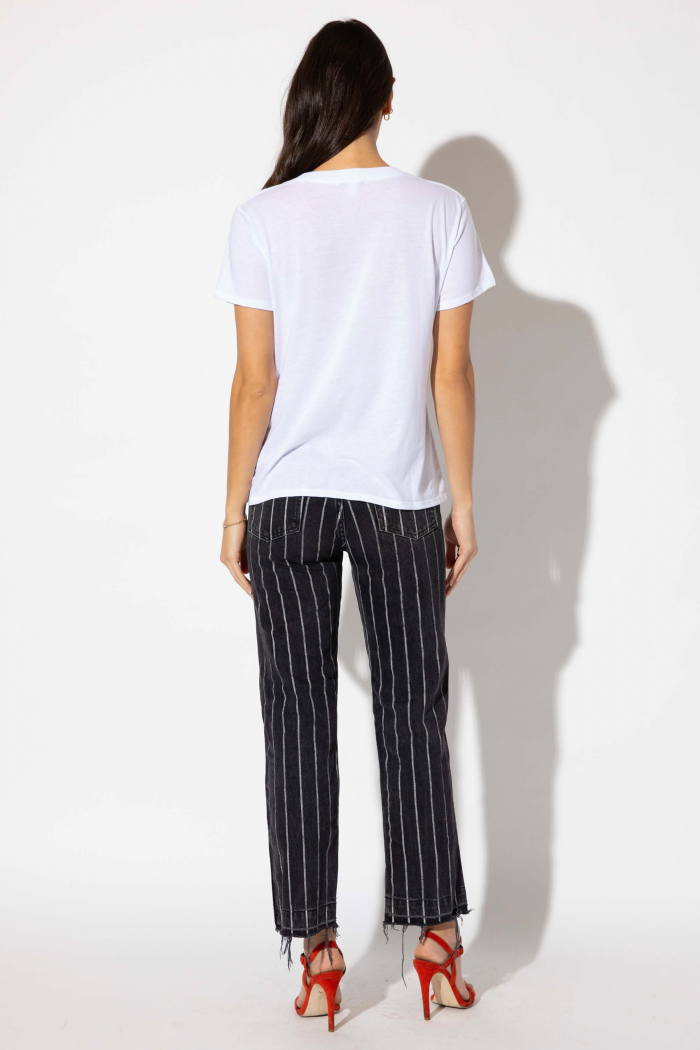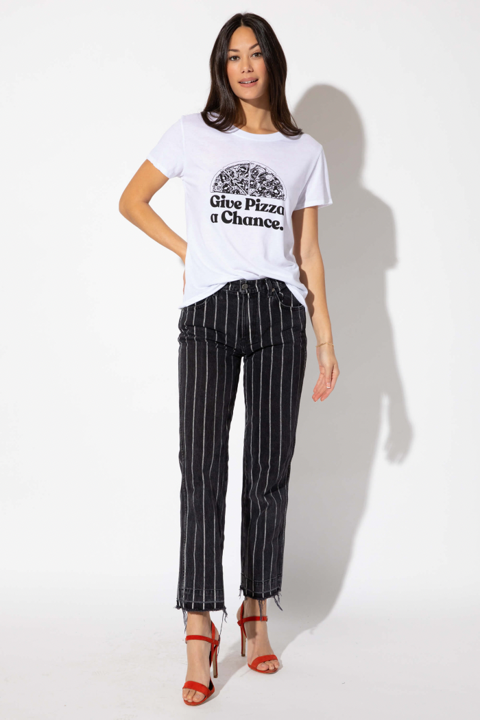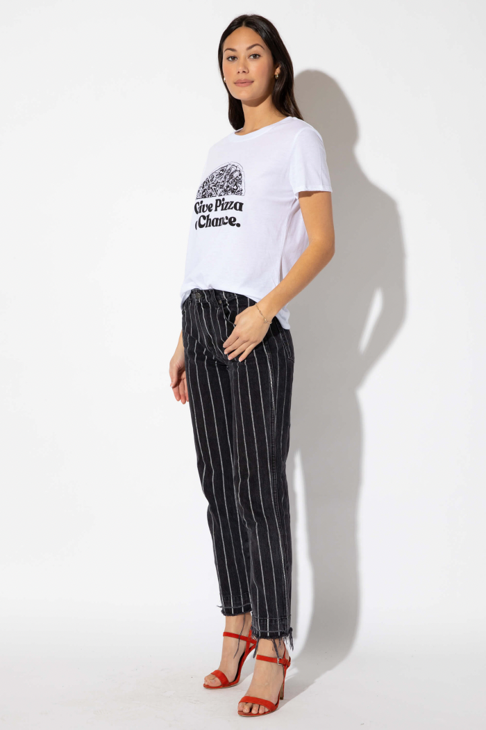 Give this tee a chance! It fits exactly how you want it to - fitted up top and looser towards the bottom with the perfect amount of room for extra pizza tonight! Made from a soft cotton blend, you won’t want to take it off and it looks great layered with other pieces.