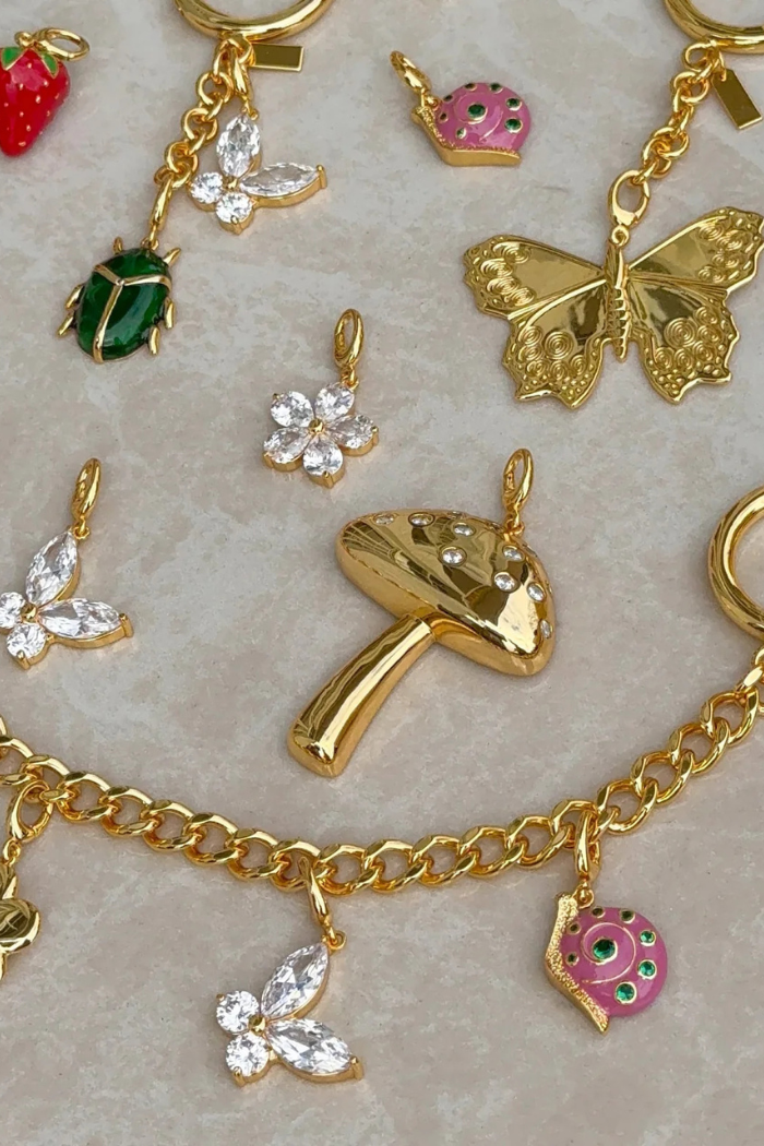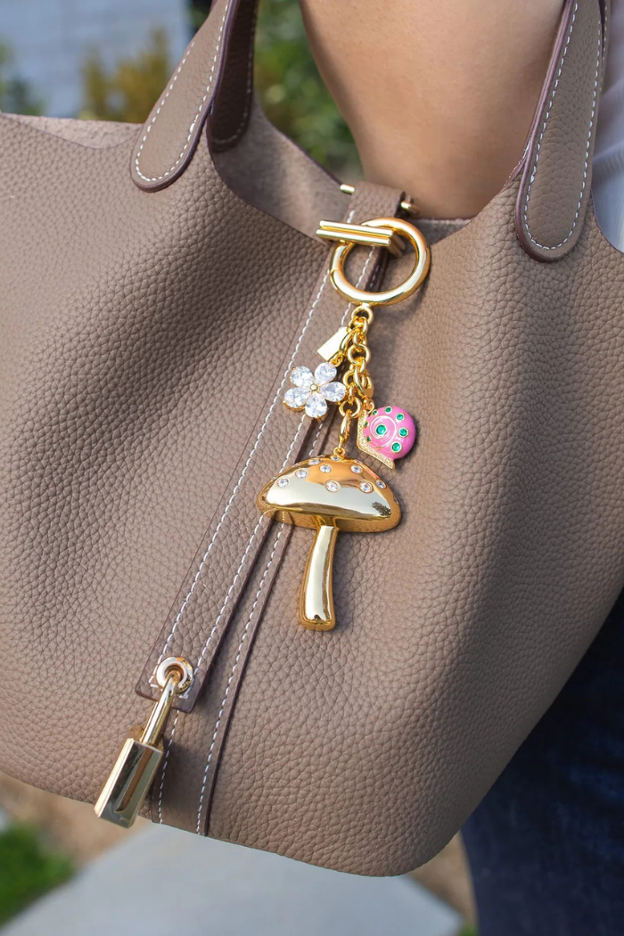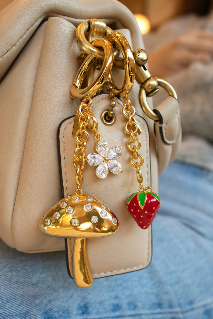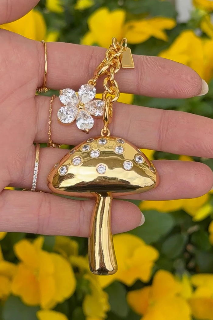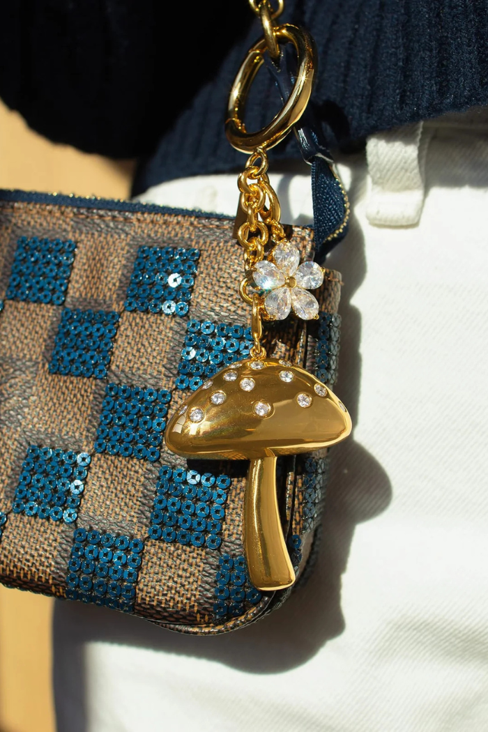 Our Golden Mushroom Bag Charm is the power up you never knew your bag needed. Add some enchantment to your everyday life with this accessory. Its radiant 18k gold plated finish and crown of crystals bring a pop of extra sparkle to your bag. The possibilities to accessorize are endless. Add this bag charm to your - bag, keychain, shoes, hair, jeans, jacket etc.. The choice is yours!