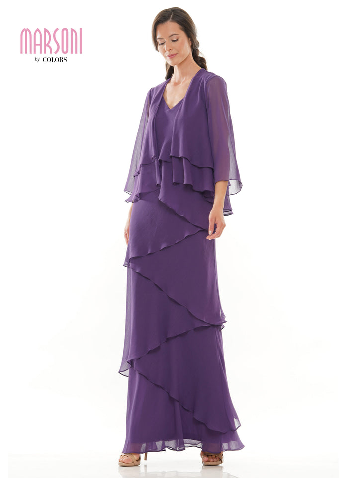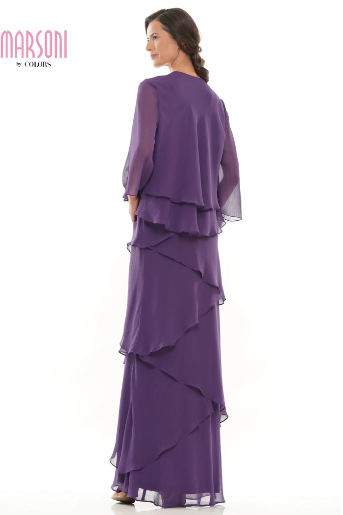 Light and airy 44″ crinkle chiffon fit and flare dress with V neck, ruffle skirt, jacket.