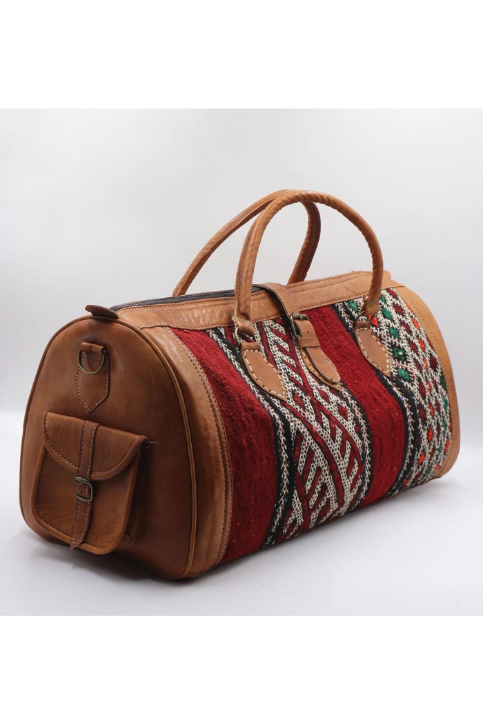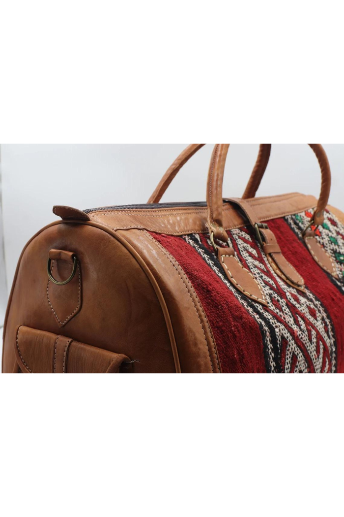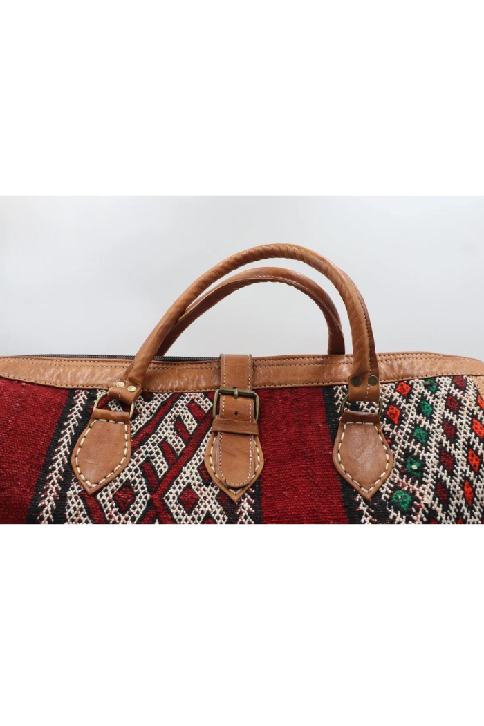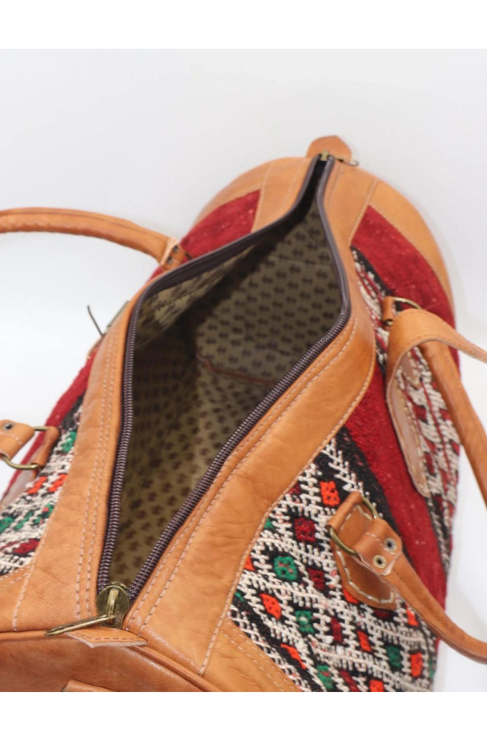 This handwoven kilim travel bag is made from full-grain leather and old carpet and is perfect for your bohemian wardrobe. This work of art was created with a unique vintage kilim that was upcycled and weaved with vibrantly colored wool by skilled craftspeople in Marrakech, Morocco.