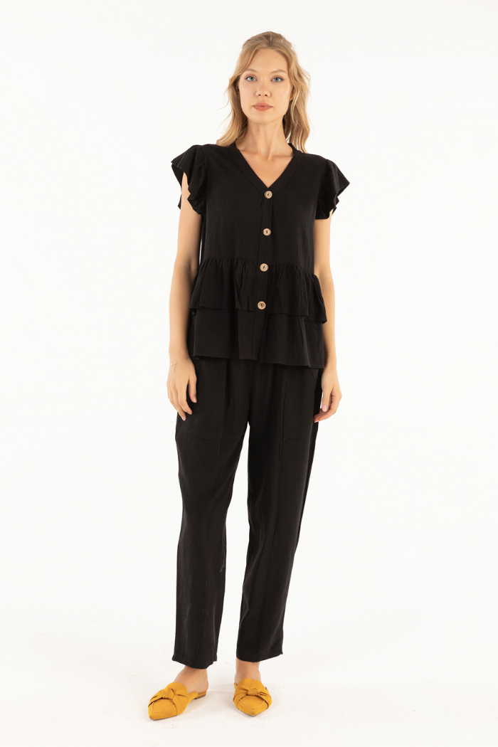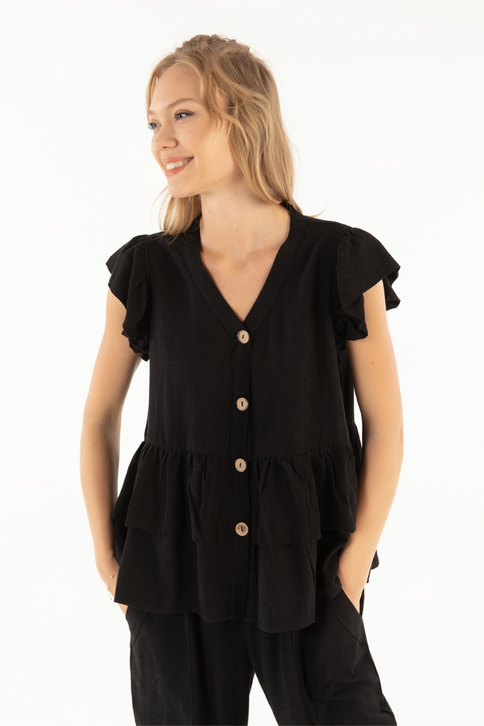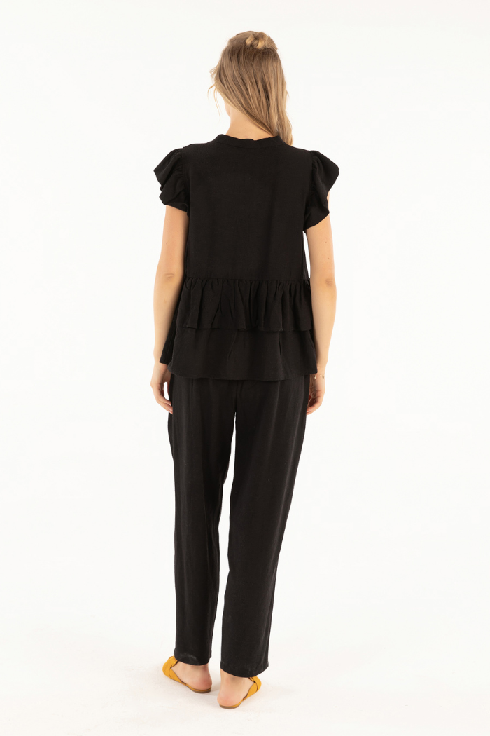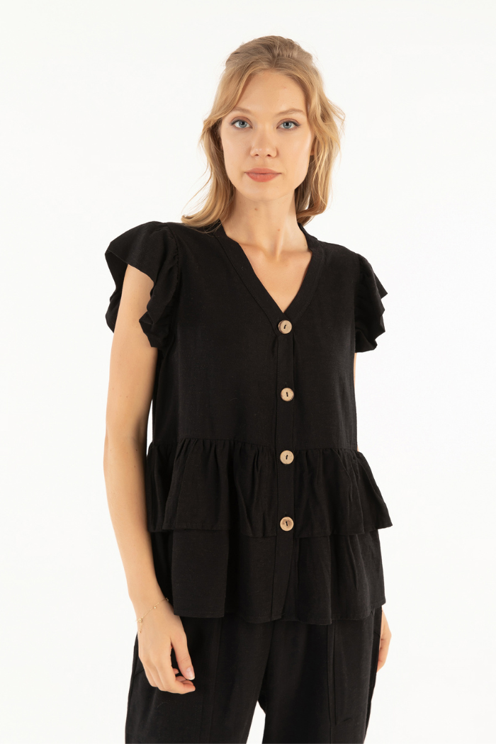 A warm-weather essential with a playful twist, the Melton Top is the lightweight cotton blouse your summer wardrobe has been waiting for. Designed with flattering cap sleeves, a soft V-neckline, and functional button-down front, it features subtle tiered ruffle details that add texture without feeling too fussy.