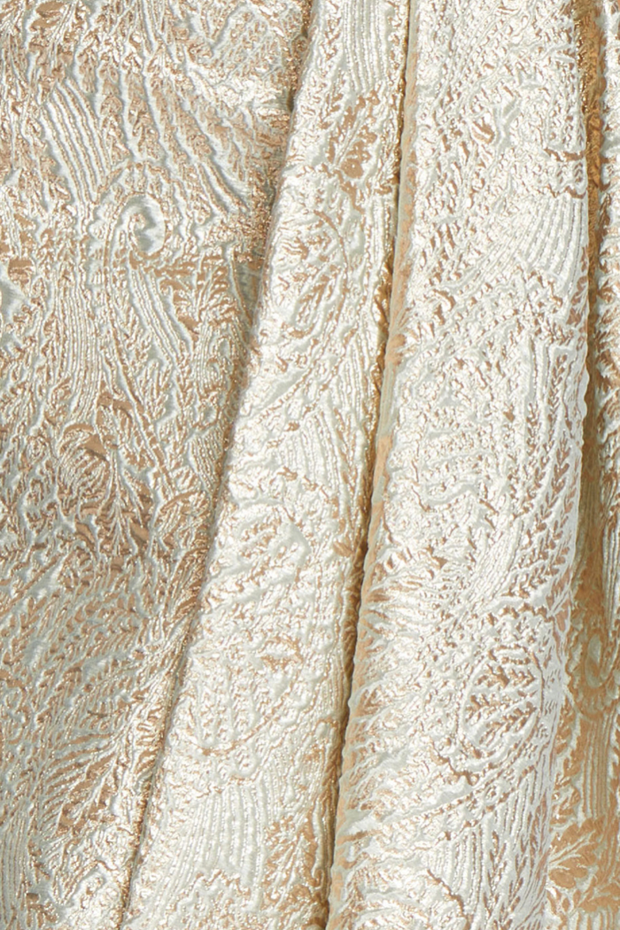 This sleeveless cocktail dress speaks for itself! Fashioned from sage and gold metallic jacquard fabric and featuring a surplus v-neckline, side drape over skirt, sleeveless sleeves. The sheath silhouette slims and shapes the figure.