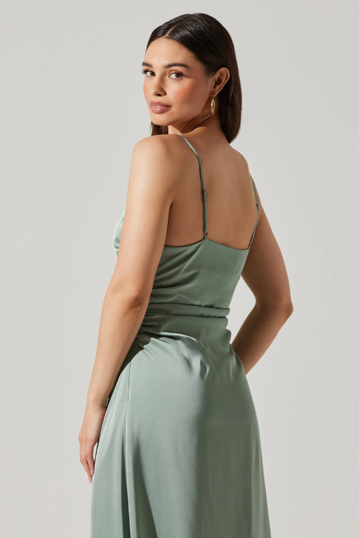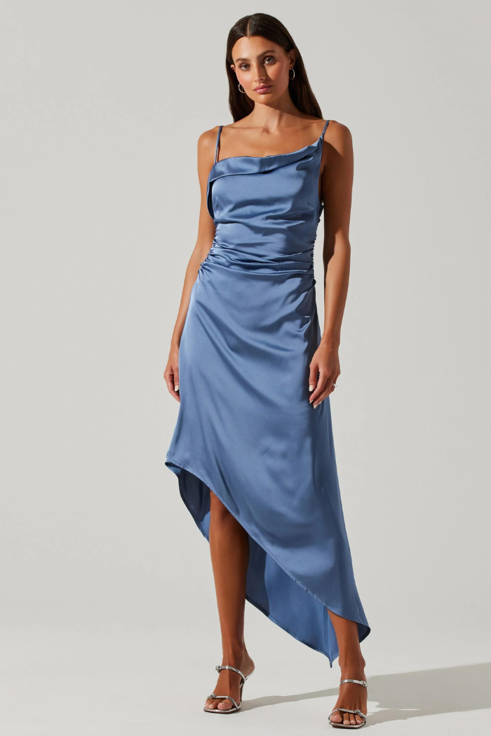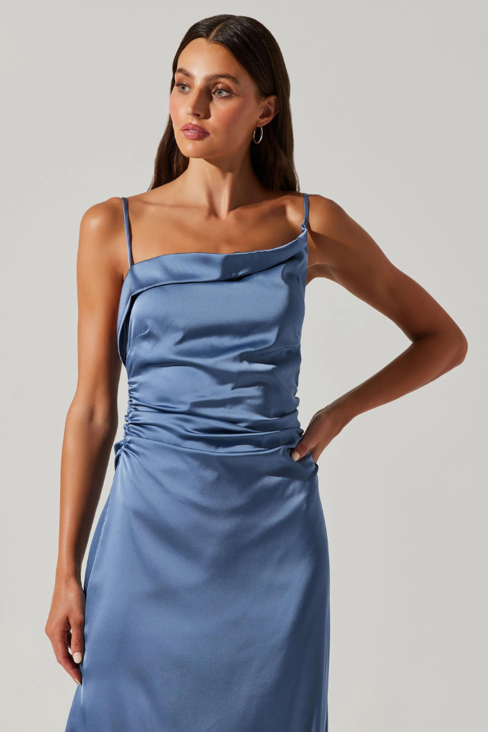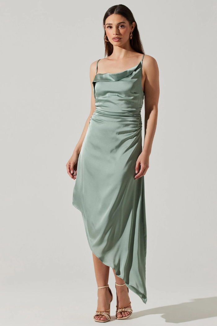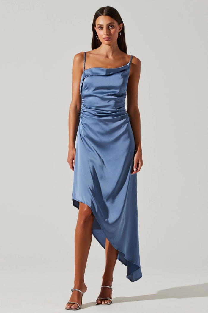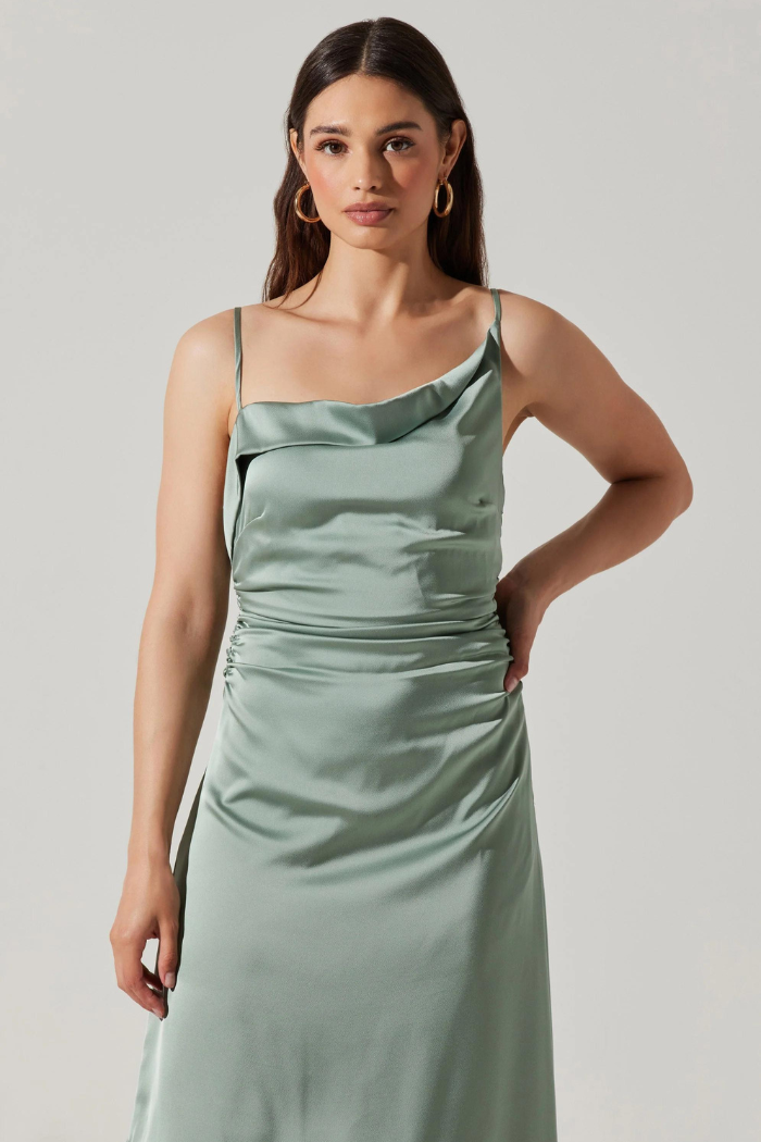 Feel elegant and stylish in our Mirie Cowl Neck Midi Dress. Made from luxe satin, this dress features a flattering asymmetrical hem and a ruched bodice. Perfect for any wedding guest, it also comes in two stunning colors and has adjustable straps for a perfect fit.