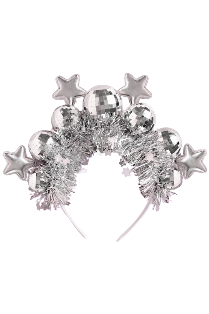 Be a dancing queen for the night with a disco stars and balls headband. White headband with silver star fringe. It includes 7 attached disco balls and 4 puffy stars One size fits all!