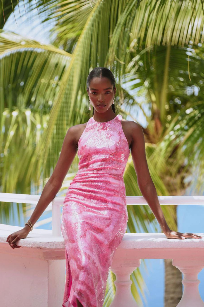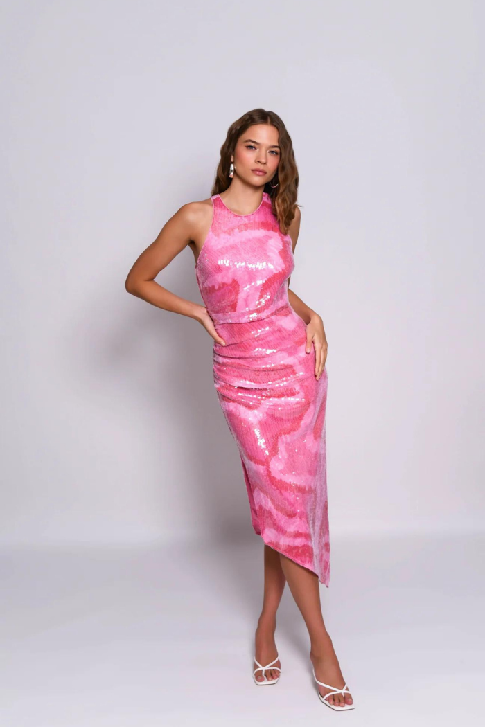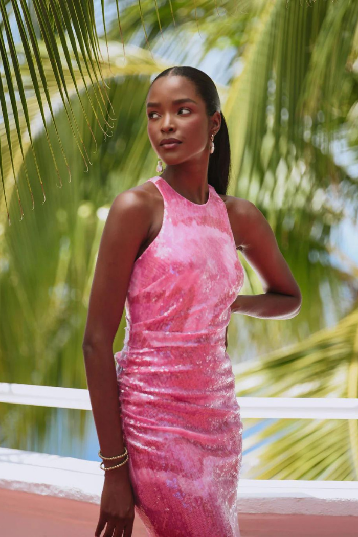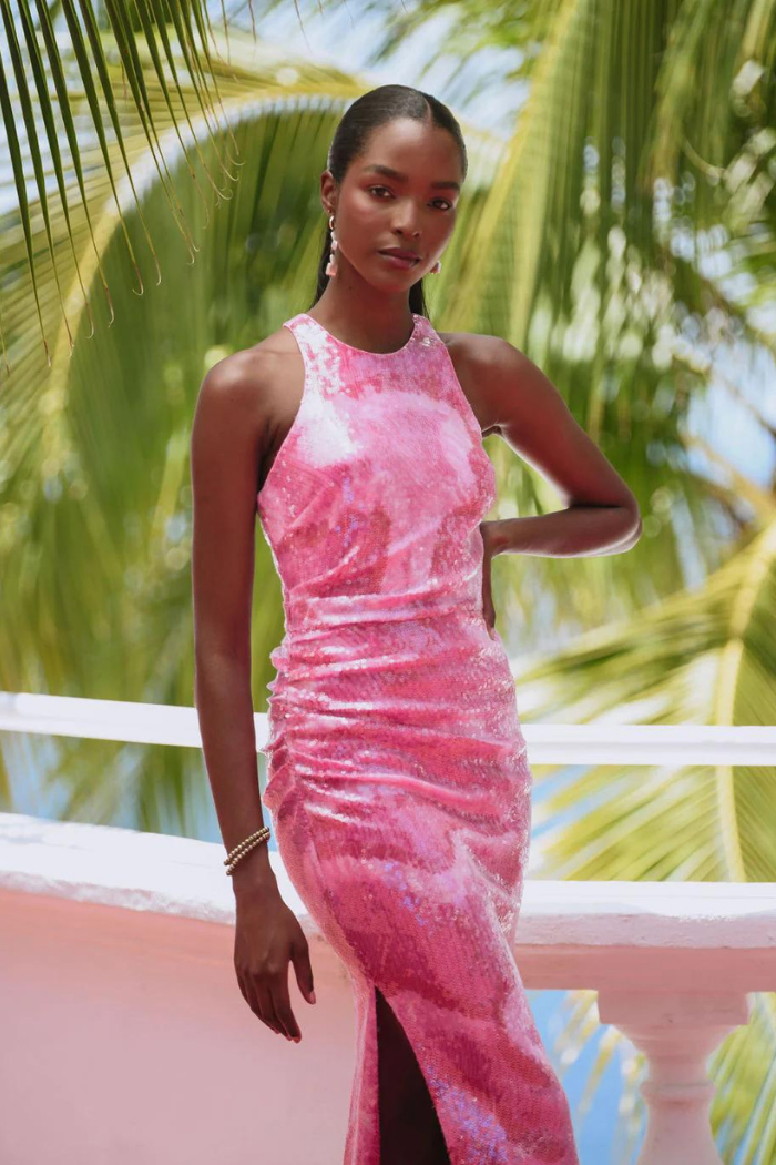 Elevate your style with the Perla Dress. The fitted, racerback design boasts sheer sequins for a touch of glam, while the bright pink color adds a vibrant pop. The midi length, ruched bodice, and side slit create a flattering silhouette, making this the perfect dress for any wedding guest.
