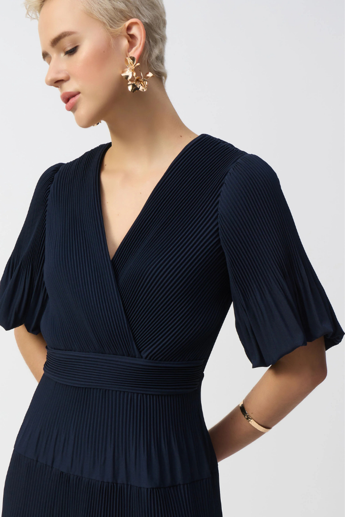 With a flowing trapeze silhouette and puffed elbow sleeves, you'll be relishing in the ease of movement and pure elegance of this v-neck midi dress. Its wrap-style bodice defines your waist, while the pleating in the skirt creates depth and motion.