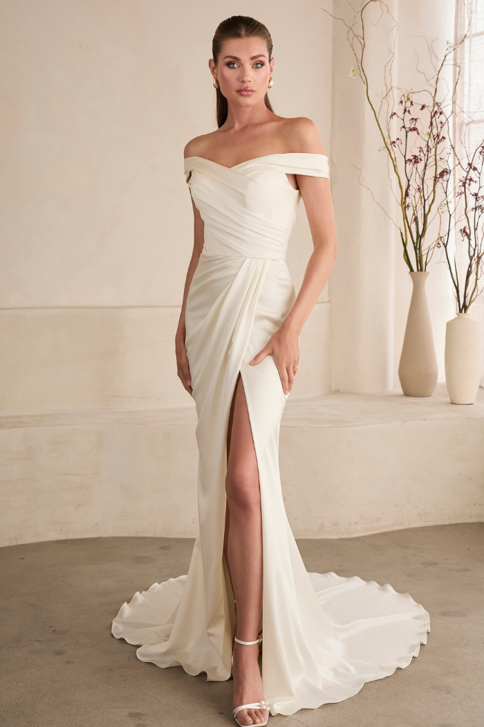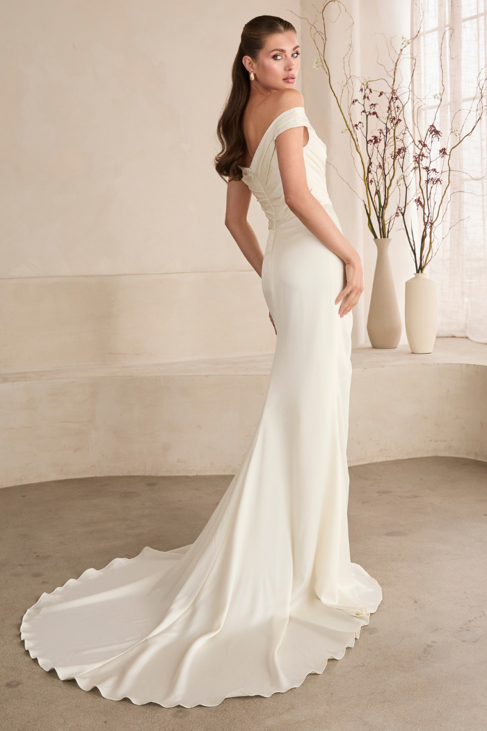 Le Blanc’s LE152 Priya dress channels modern elegance at its most elaborate. It's cut from perfecting satin, lining, and stretch chiffon, featuring an off-shoulder neckline to highlight the collarbone and décolletage beautifully. Appreciate the soft, sheath silhouette and pleated detailing draped throughout the 12-point structured bodice, waistline, and top of the skirt. One of Priya’s standout elements is her sultry leg slit, allowing the bride to move freely throughout her romantic celebration. Thoughtfully made with iconic photo moments in mind, this gown showcases the perfect 63-inch train for added flair.