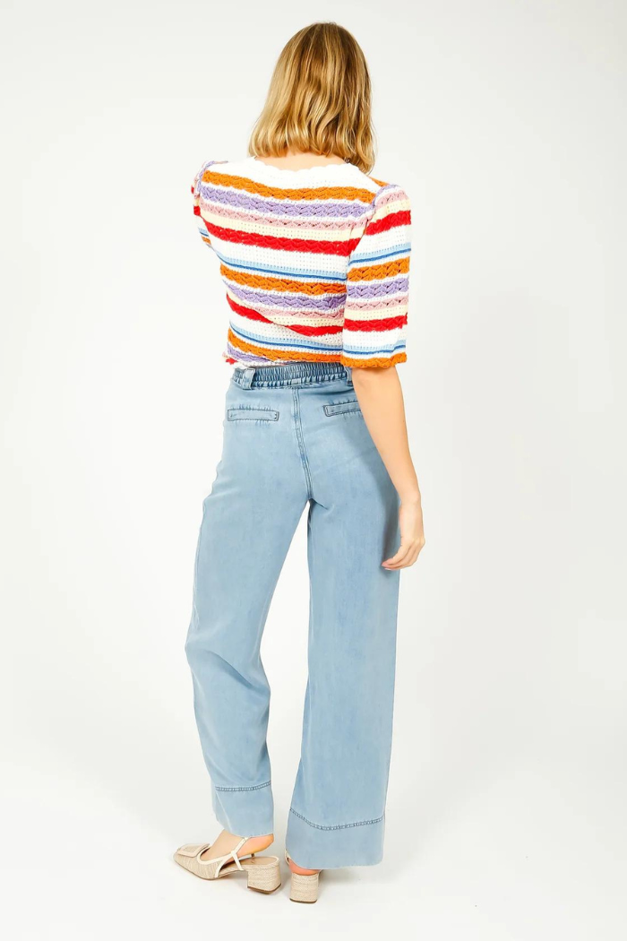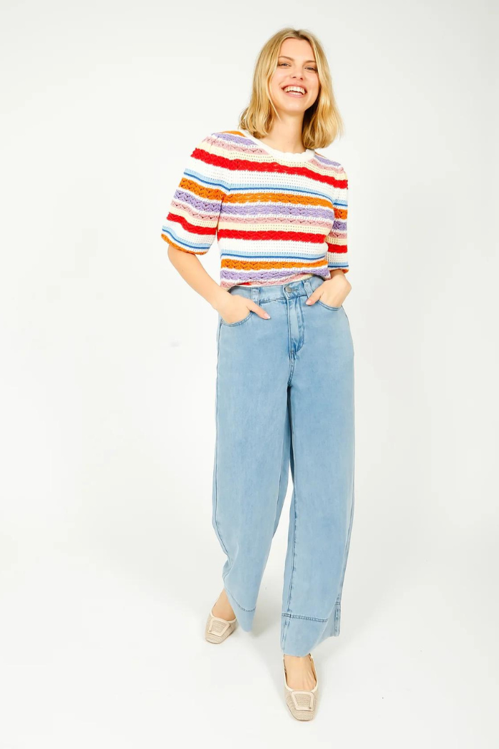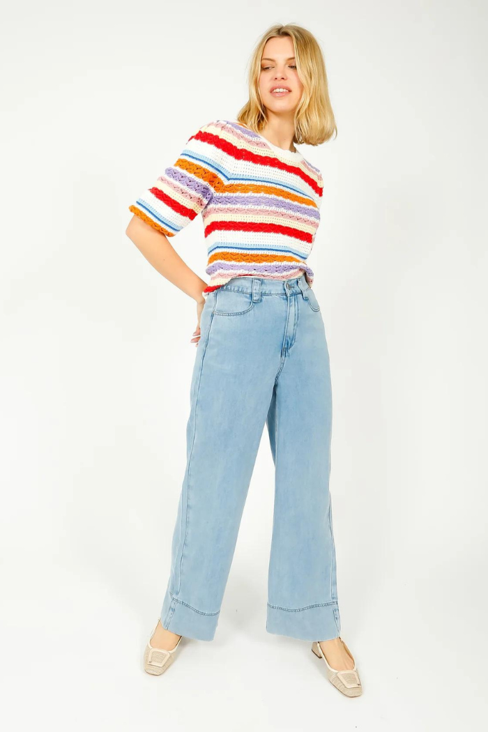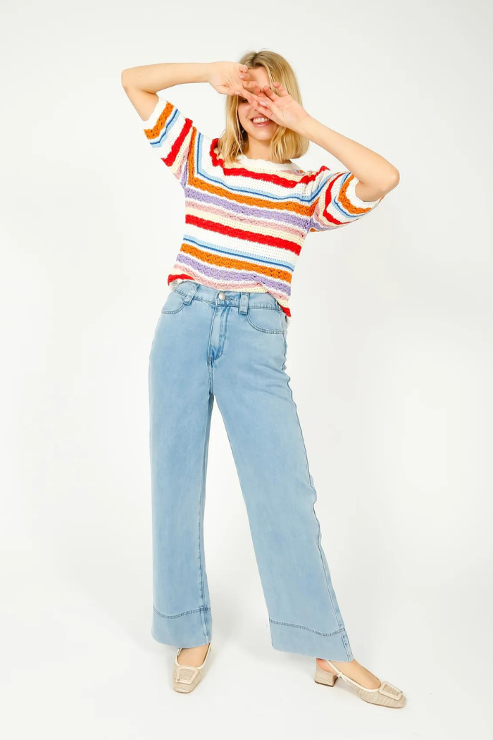 The Romy Jeans are here to elevate your style game! Crafted with light weight chambray, these full length, wide leg jeans provide the ultimate comfort. The mid rise fit and light wash denim add a touch of sophistication to your look. Upgrade your wardrobe with Romy Jeans!