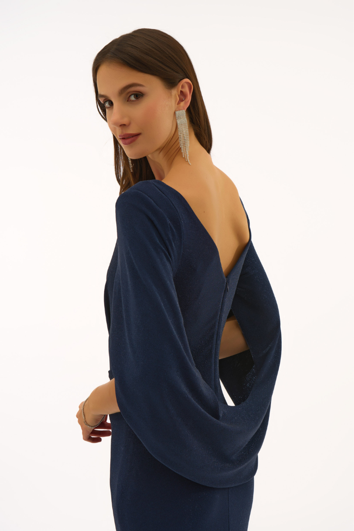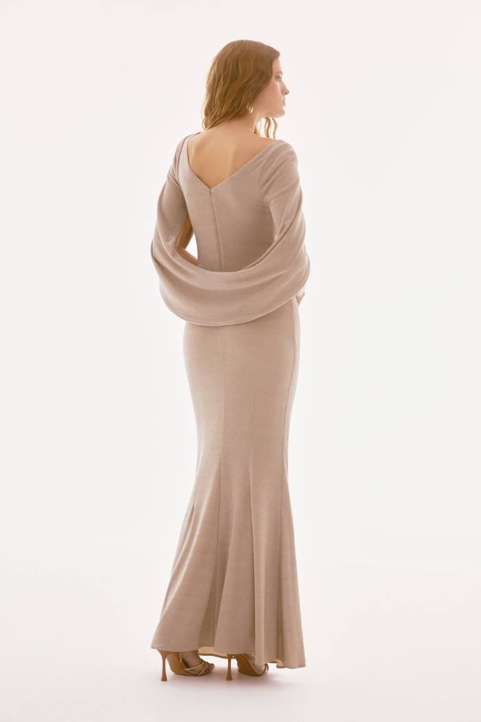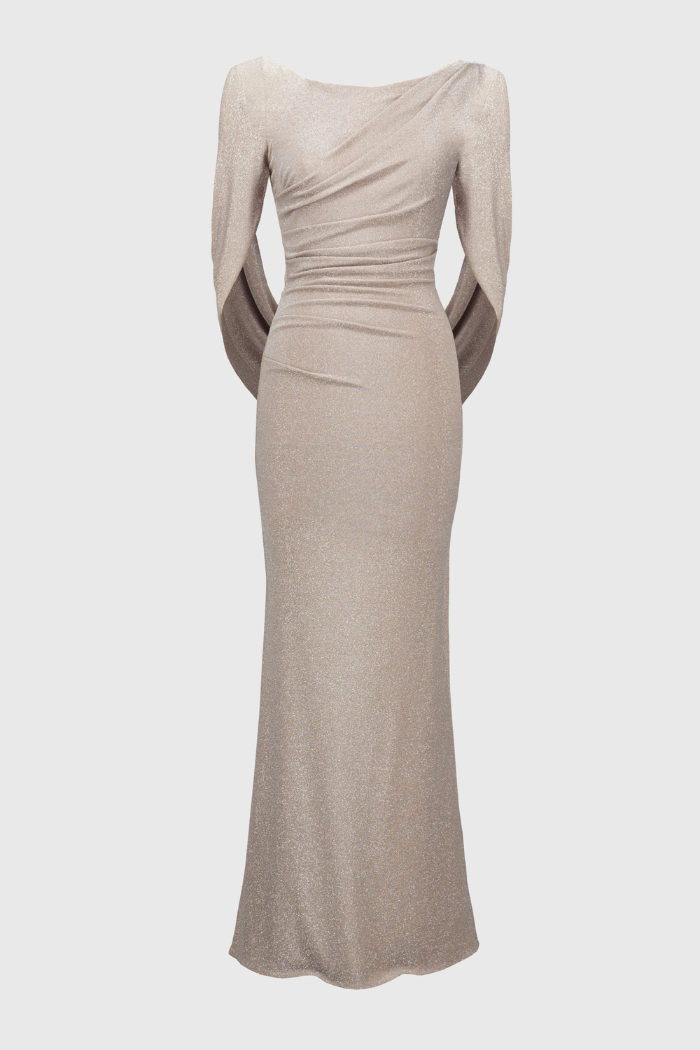 Capture the attention of everyone in the room in this shimmering full-length dress. Cut in a fitted trumpet silhouette, this dazzling dress is adorned with attractive pleating at the bodice, and draped back sleeves for a hint of drama. A demure boat neckline and a discrete back zipper closure complete this visual stunner. Part of the Signature collection.