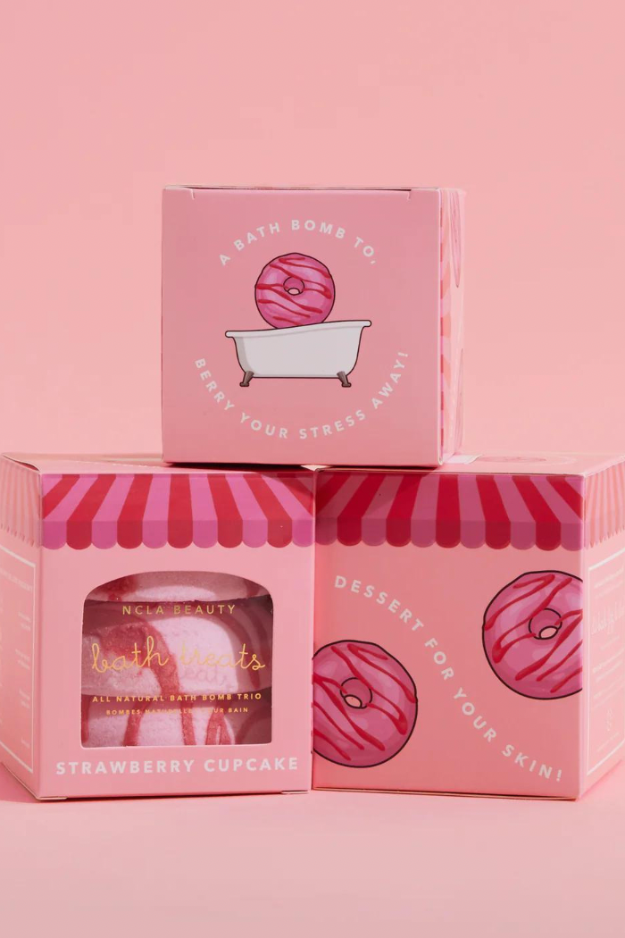 Each set comes with 3 donut shaped bath treats made with nourishing, skin-soothing, and hydrating ingredients like epsom salt, kaolin clay, and shea butter. It's also infused with an essential oil blend to bring an aromatherapeutic experience to your bath time.