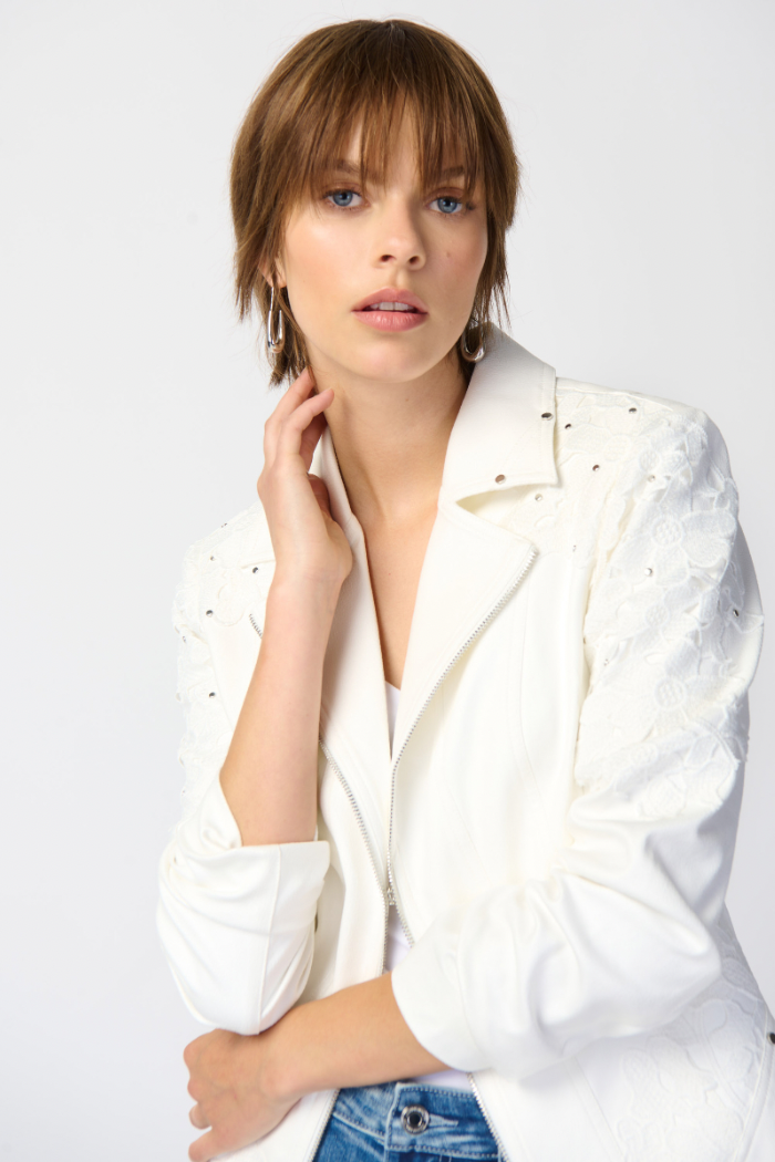 Step into the spotlight with this dazzling jacket. Crafted from luxuriously soft foiled suede, it boasts a playful guipure floral appliqué adorned with statement studs. Practical yet fashionable, it fastens with a hook-and-eye closure for easy wearability.
