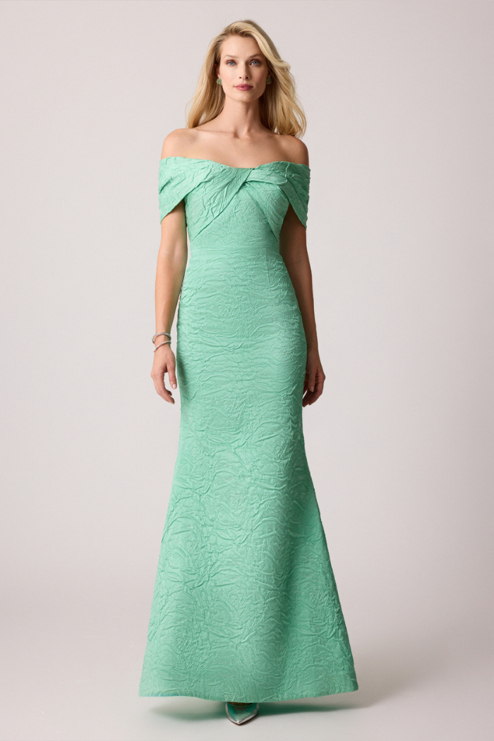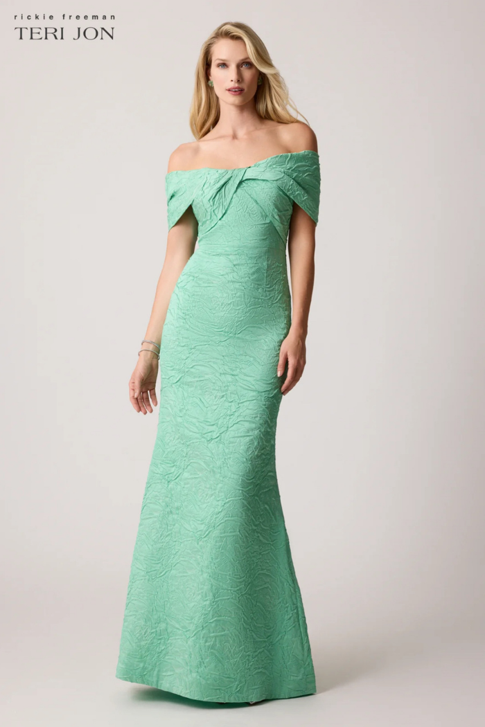 Exude timeless grace in the Teri Jon 259078, a masterpiece of evening wear designed for life’s most celebrated moments. Crafted from luxurious embossed jacquard fabric in a refreshing Mint Green, this gown features a sophisticated off-the-shoulder neckline and a signature twist bodice that beautifully contours the frame. Whether you are the Mother of the Bride or a guest at a formal gala, its flared silhouette ensures effortless movement and unforgettable elegance from the ceremony to the dance floor.