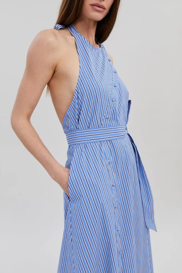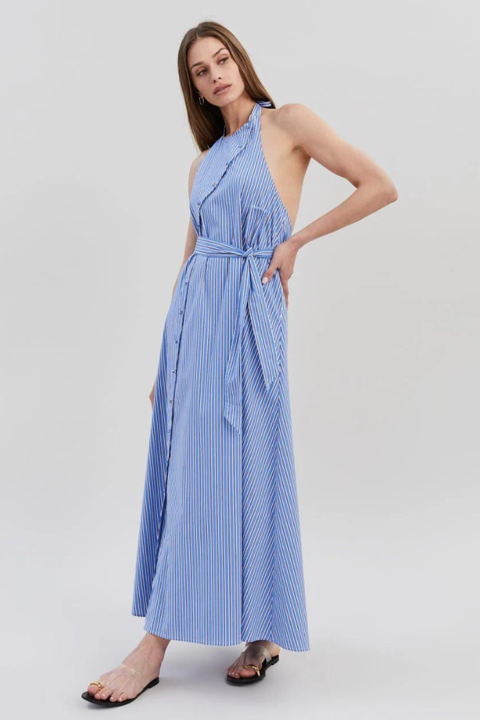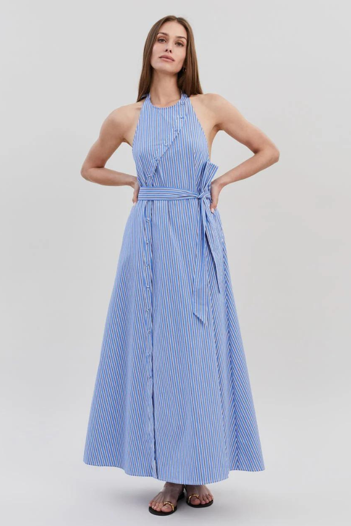 The Cara Dress, cut from our cotton poplin fabric, features an a-line silhouette and open back, with a full length skirt. This style is complete with button details across the front and a removable waist tie.