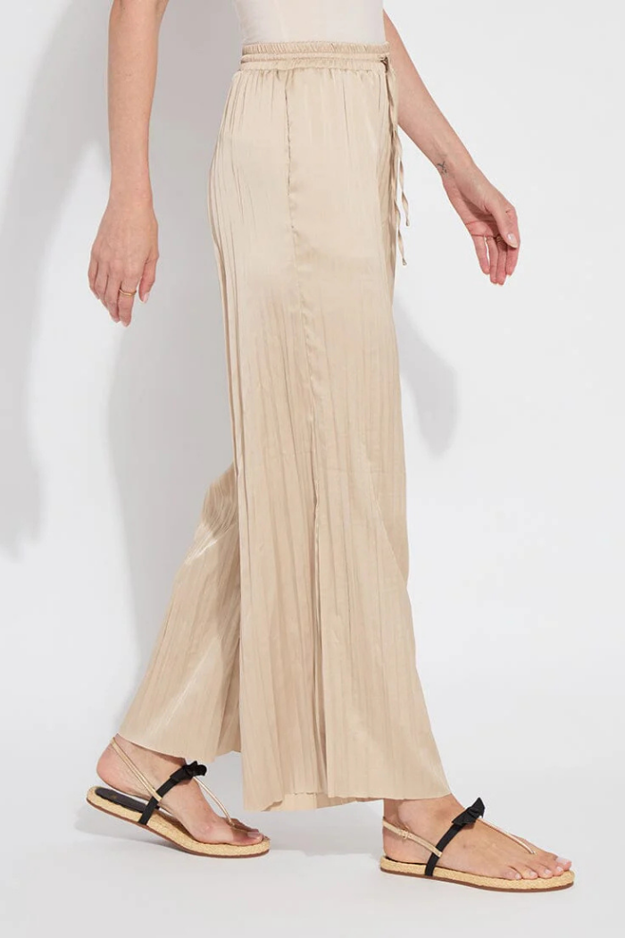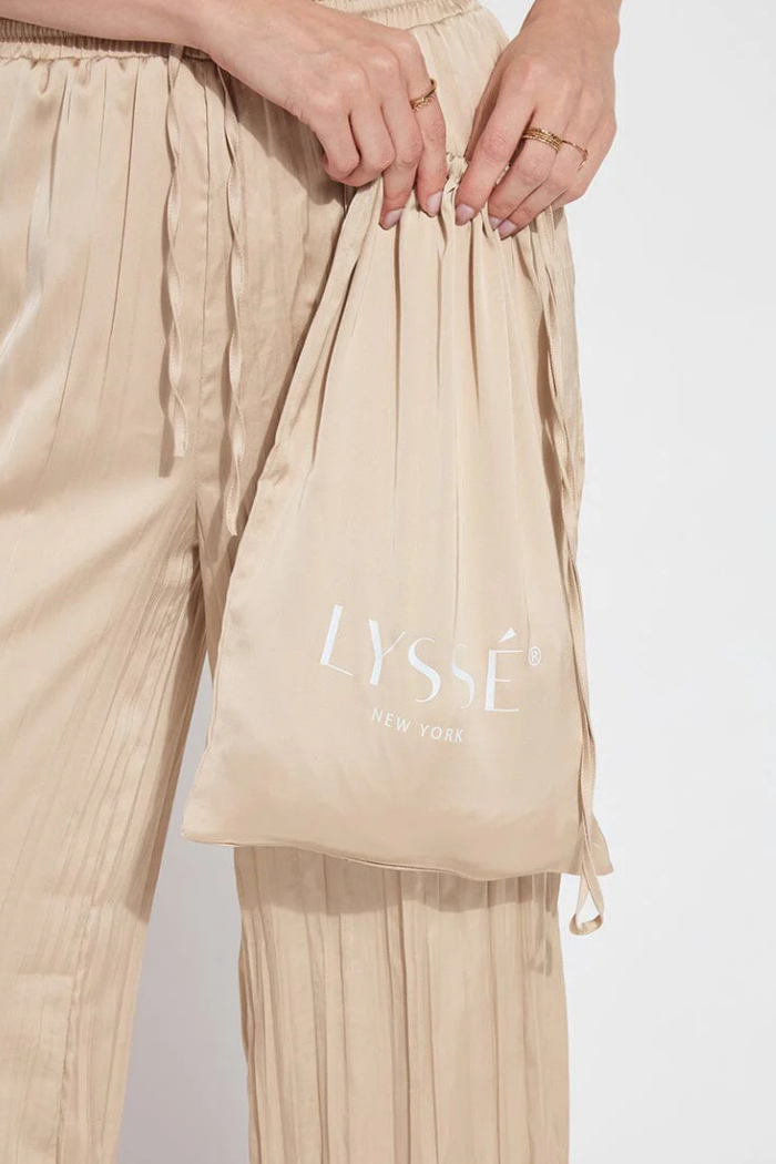 Made from Soft Touch Satin, The Packable Pleated Palazzo Pant offers functional side pockets, permanent pleats, an easy drawstring and raw-cut hem that’s easy to alter. We love these pants paired with the Bria Sequined V-Neck Shell and sandals. To store or pack, twist the pants longways and then again like a pretzel. Place inside the accompanying bag. Remove from your luggage and they are ready to wear. Machine wash and hang dry. Twist and bag again for storage.