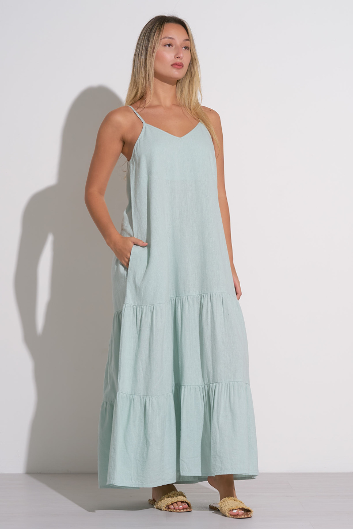 Effortlessly chic and made for summer, the Elan V-Neck Tiered Maxi Dress in Teal Light is your go-to for easy, flattering style. Crafted from a breezy, lightweight fabric that’s not see-through, this maxi dress is both practical and polished. It features a soft v-neckline, adjustable straps, and a relaxed tiered silhouette that flows beautifully on the body. The fit is generous, making it ideal for a range of body types, and yes—it has pockets for that extra touch of convenience.