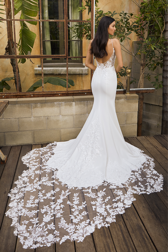 BL456 Venus is a breathtaking fusion of whimsy and elegance. Featuring an angular, notched neckline with delicate beaded spaghetti straps, this fit-and-flare gown is crafted from matte stretch satin, lining, and tulle. The bodice creates a statuesque shape with 8-point boning and a sheer back. The gown is adorned with stunning lace appliqués, intricately beaded and sequined, adding a touch of sparkle and texture with delicate placements to accentuate the figure that cascade into a sleek skirt. The simplicity of her skirt in the front transitions into a show-stopping 101-inch train featuring intricately crafted illusion tulle with blooming appliqués on a scalloped hem. Complete this goddess-like ensemble with her matching fingertip veil, BL456V, offered separately.